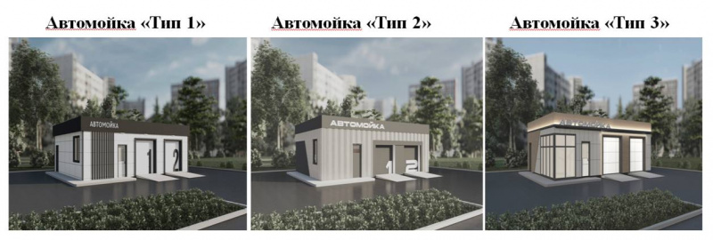 Так, предусматривается три типа автомойки, к которым устанавливаются индивидуальные требования к цветовому решению и к способу размещения декоративных элементов внешней отделки. Выбор типа автомойки осуществляется владельцем по собственному усмотрению.