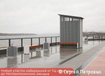 Что касается променадной части, здесь выполнена укладка тротуарной плитки, обустроено ограждение. На объекте появились новые и современные малые архитектурные формы: скамейки, урны. Все они выполнены в едином стиле с остальной частью набережной. Кроме того, на новом участке набережной провели озеленение: высадили деревья, кустарники и разнотравье, обустроили газоны. Примечательно, что при оформлении декоративных клумб использовались камни из Вижайского карьера и растения из прикамских питомников. Также на новом участке появились кадки с деревьями и многолетними кустарниками.